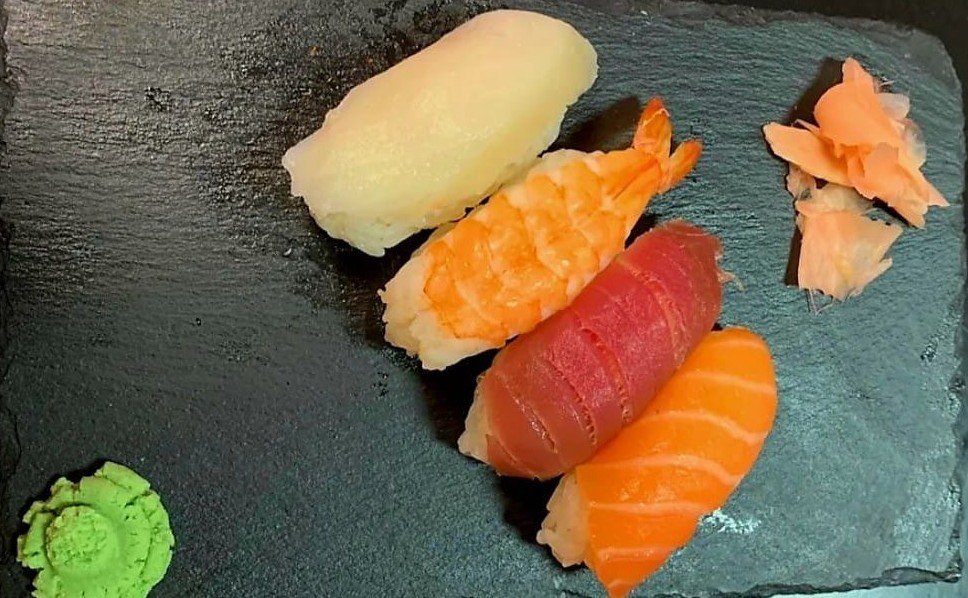 Bandeja 4 niguiris pez mantequilla o escolar negro con pasta de trufa y cebollino