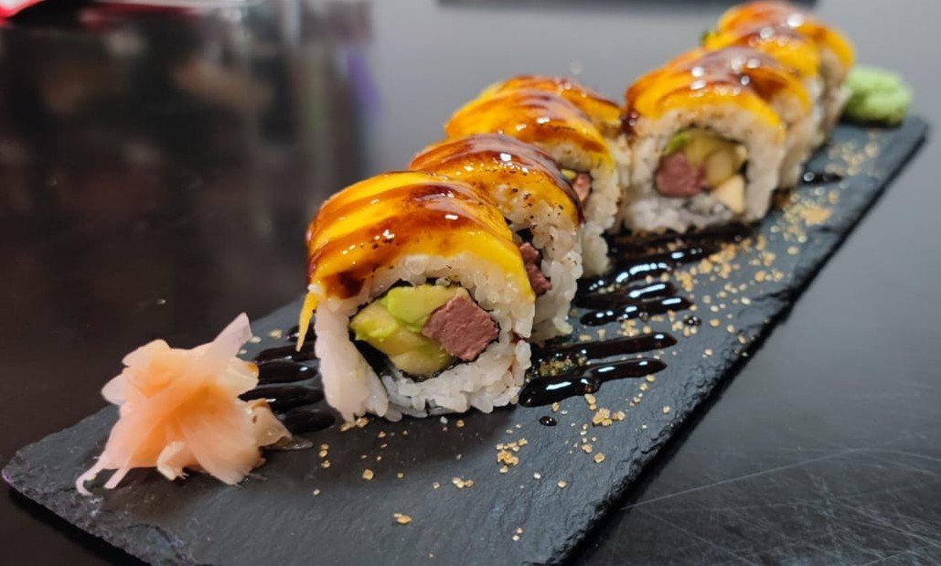 (Manzana, aguacate, foie, mango, azúcar moreno sopleteada y teriyaki)
