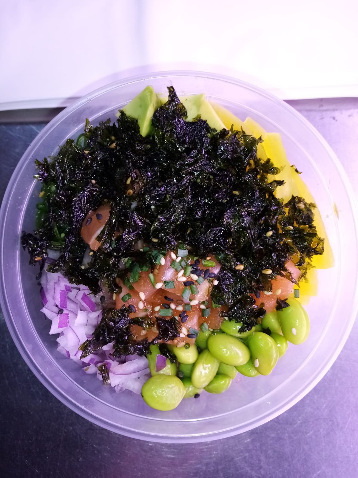 Arroz, salmón, rábano takuan, cebolla roja, wakame, aguacate, edamame, sésamo tostado, alga crujiente, yakiniku (BBQ Japo), cebollino.