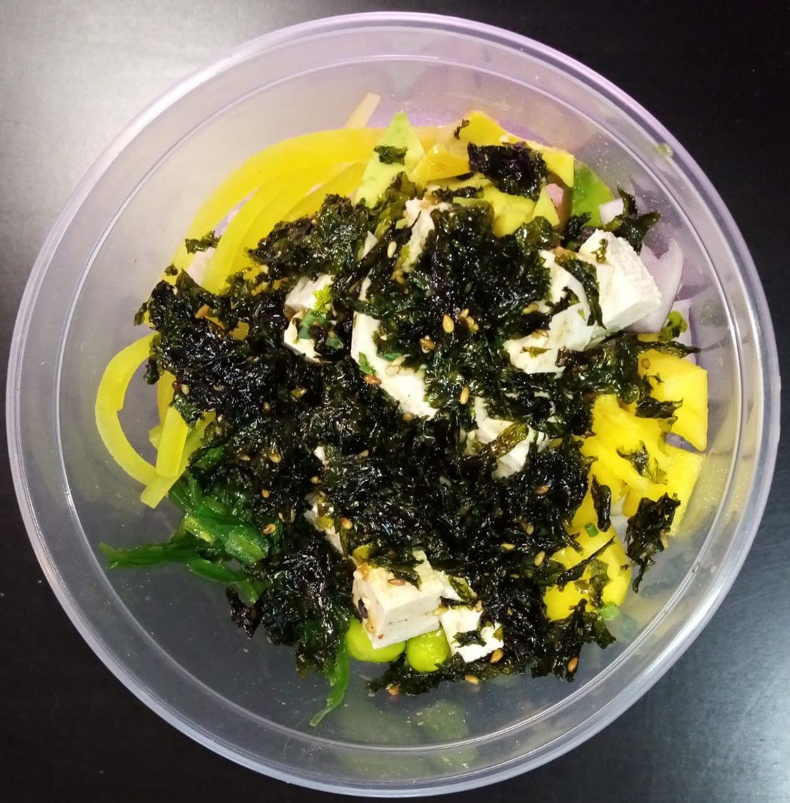 Arroz, wakame, cebolla roja, mango, tofu, sésamo tostado, edamame, cebollino, alga crujiente, rábano, aguacate, yakiniku (BBQ Japo).